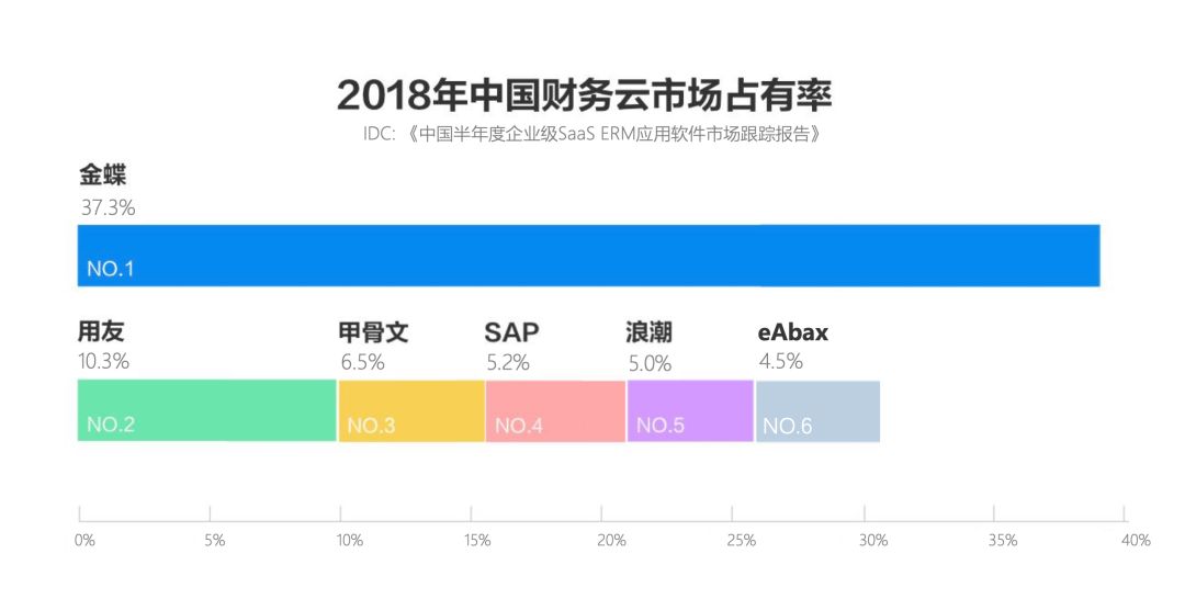 IDC另外一份报告《中国半年度企业级SaaS ERM(企业资源管理)应用软件市场跟踪报告》(2018上半年)显示,金蝶在2018年上半年的SaaS财务云市场占比达37.3%,金蝶继续遥遥领先,其整体份额是第2至第6名之和,这是继2016年和2017年之后第三次成为SaaS财务云冠军。